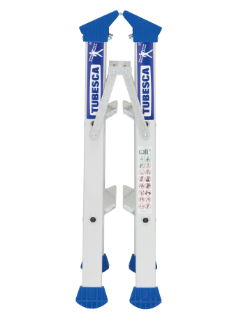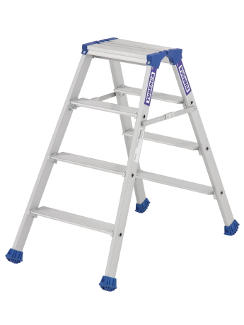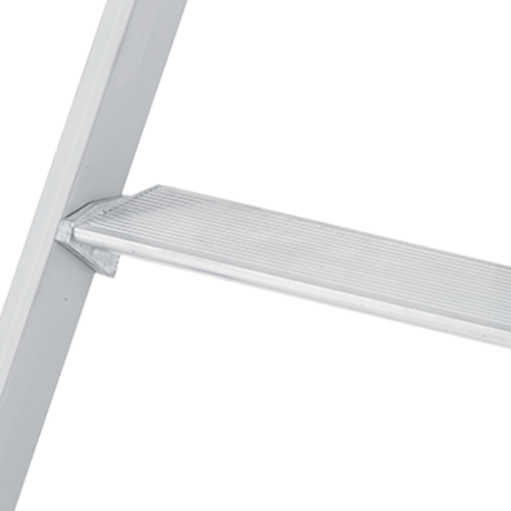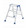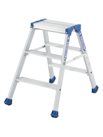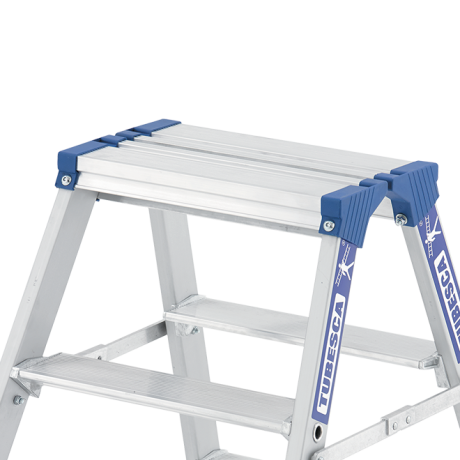 Ce marchepied Platinium double plans de montée en aluminium dispose de marches de 90 mm avec système de rotation breveté et d'une plate-forme de 350 x 220 mm. Grâce à ses bras anti-repliement et ses sabots haute sécurité il est l'escabeau double le plus fiable du marché. Il répond à la norme EN 131 et au décret 96 333.