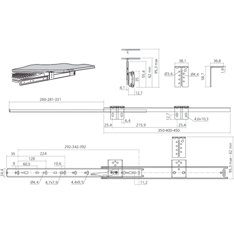 Equerres de montage réglables en hauteur de 62 à 93 mm.