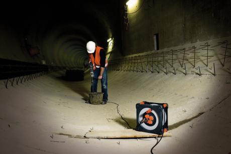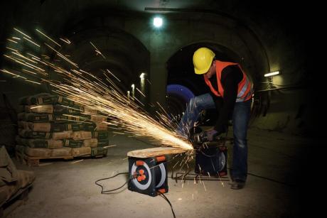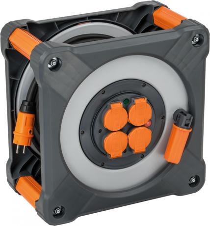 - Enrouleur de câble avec boîtier en Rubbabren (mélange plastique/caoutchouc) particulièrement résistant aux chocs, pour une utilisation en extérieur et dans les conditions intensives sur chantiers