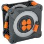 L’enrouleur de câble professionalLINE dispose de câble H07RN-F 3G2,5. Cet enrouleur électrique, de forme cubique, est doté d'un bloc muni de 4 prises de courant avec clapets à fermeture automatique, d'un voyant de présence de tension et d'un disjoncteur thermique. De plus, le dérouleur de câble est doté d’une protection anti-retournement et d'une poignée rabattable pour dérouler et enrouler le câble sans effort. La structure de l'enrouleur électrique, le Rubbabren, est composé d'un mélange de plastique et de caoutchouc particulièrement résistant aux chocs, conçue pour l'extérieur et une utilisation intensive sur chantier (jusqu'à -25°C). Des poignées de transport résistantes sur les 4 côtés, trous de rangement pour la fiche, frein de tambour évitant le déroulement du câble durant le transport font de cet enrouleur de câble, fabriqué en France, l'accessoire indispensable du chantier. Découvrez ci-dessous les caractéristiques détaillées du produit :