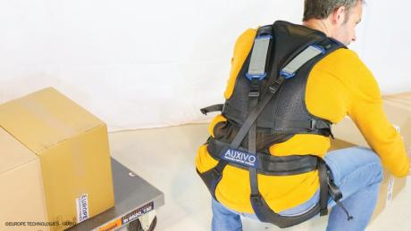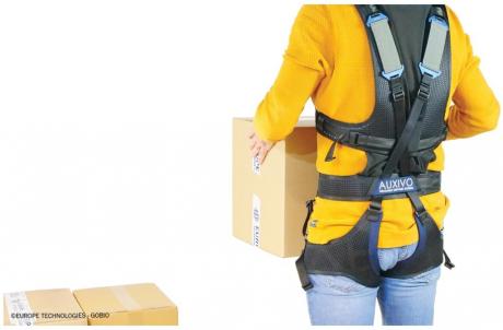 IP03 LiftSuit® de AUXIVO est un ergosquelette de posture, en textile léger. Il soulage les muscles du dos et des hanches lors du port d’objets ou du travail en position penchée vers l’avant.