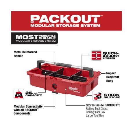 - S'adapte à l'intérieur de : PACKOUT™ Large Box, PACKOUT™ Trolley Box, PACKOUT™ XL Tool Box, PACKOUT™ Rolling Tool Chest.