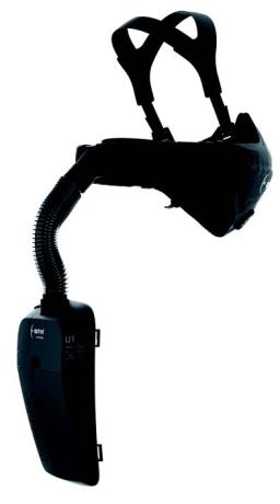 Système de protection respiratoire swiss air, noir, comprend un demimasque confortable, une unité de soufflerie, des tuyaux de raccord, un bandeau pour la tête et la nuque, une unité porteuse pour les épaules, un panneau de commande et un chargeur.