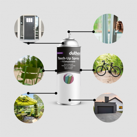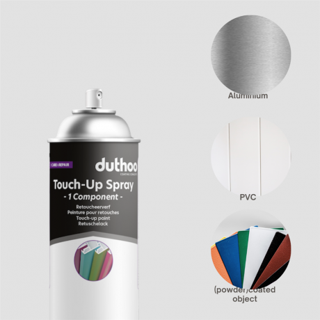 Avez-vous remarqué un dommage moyen sur votre objet en PVC ou laqué? Pas de panique, avec le spray de retouche Duthoo, vous pourrez réparer les dégâts dans la bonne couleur de peinture en poudre. Votre fenêtre, porte, garage, clôture ou même votre vélo peuvent être réparés avec notre bombe de retouche.